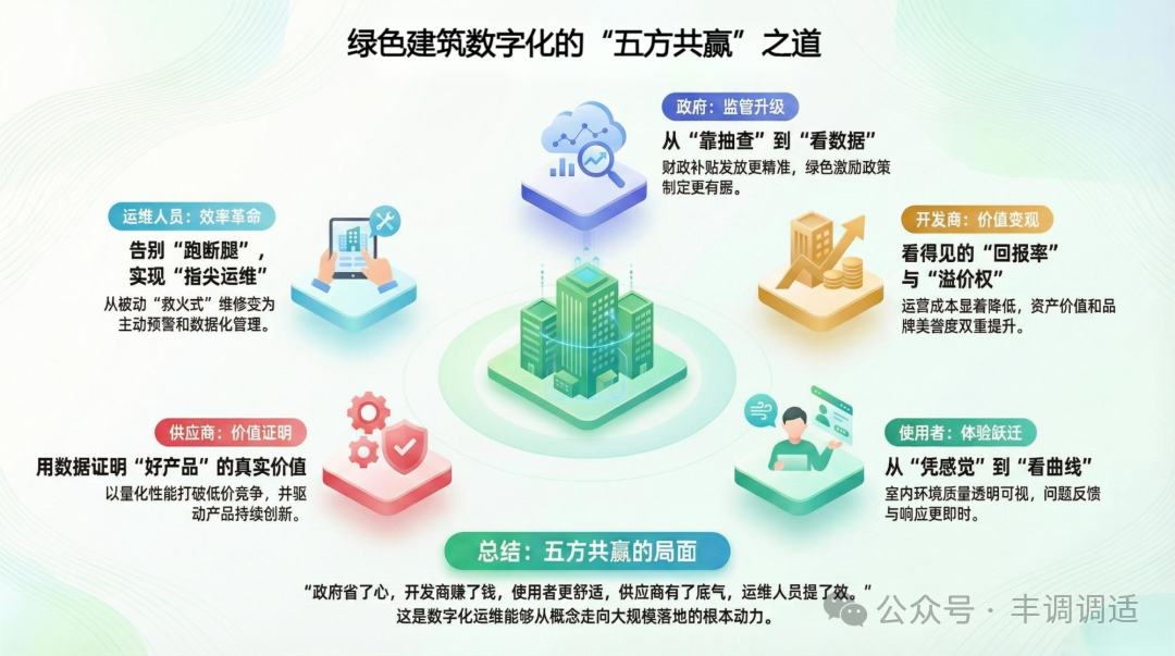 在建筑行业,绿色建筑早已不是新鲜概念。但长久以来,实现“真绿”并达成“溢价”却并非易事。很多时候,数字化转型被误解为一项纯粹的成本投入。 然而,当我们剖析那些成功落地的数字化运维项目时,会发现其本质是一场利益格局的重构。数字化运维的出现,让建筑产业链上的五个关键角色——政府、开发商、使用者、供应商和运维人员,都找到了属于自己的“赢面”。 在这场绿色建筑的数字化浪潮中,究竟谁是赢家?让我们通过一张图谱看懂背后的价值流转。
